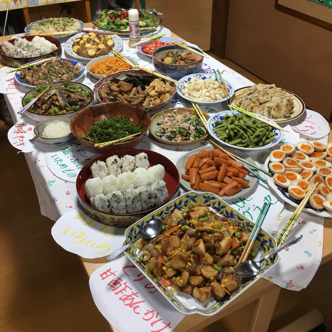 管理栄養士とボランティアさん達が毎日手作りの昼食を作っています。旬の食材を使い、メインの魚か肉料理にサラダ、煮物に漬物と汁物。野菜をふんだんに使い、目にも胃にも優しい料理です。「皆さんが美味しいと言ってくれるのが何よりも嬉しい」と張り切るボランティアさん。食事前には当日の料理等の説明、ミールラウンドも行います。おやつも手作り。チーズケーキやプリンなど日替わりで皆さんが楽しみにしています。